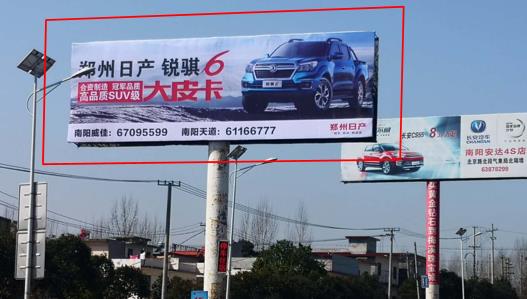 | 媒體形式:省道廣告 媒體規(guī)格:橫6mX18mx2=216㎡ 備 注:無夜間照明 媒體說明:該廣告位位置稀缺,南陽至鄧州231省道潦河大橋,八中附近,2塊可上刊,輻射城西,鄧州,該處車流量大、受眾人群眾多。該區(qū)域地理位置開闊,大面廣告幅面直接帶來強(qiáng)烈的視覺沖擊力,優(yōu)越的地域優(yōu)勢大大提升廣告發(fā)布的品牌形象。 |