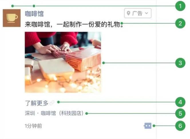 2. 外層文案;3. 外層圖片;4.文字鏈;5.門店標(biāo)識(有線下門店可選擇展示);6.用戶社交互動。