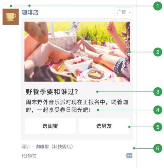 1. 廣告主頭像昵稱:用戶點(diǎn)擊可直接跳轉(zhuǎn)廣告主公眾號介紹頁;2. 外層圖片、小視頻;3. 外層文案標(biāo)題(可選);