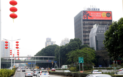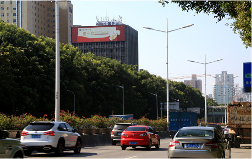 該廣告牌位于濱河路與皇崗路交匯處外運大廈西面墻體,濱河路是深圳車流密度最大的主干道之一,而皇崗路是連接市中心的交通要道,因此廣告牌垂直于路面,大氣美觀,處于十分顯眼的位置,可視距離非常遠(yuǎn),視覺效果十分突出,該廣告牌能覆蓋了羅湖,福田,南山往來的車輛及人群,受眾廣泛且層次高。
